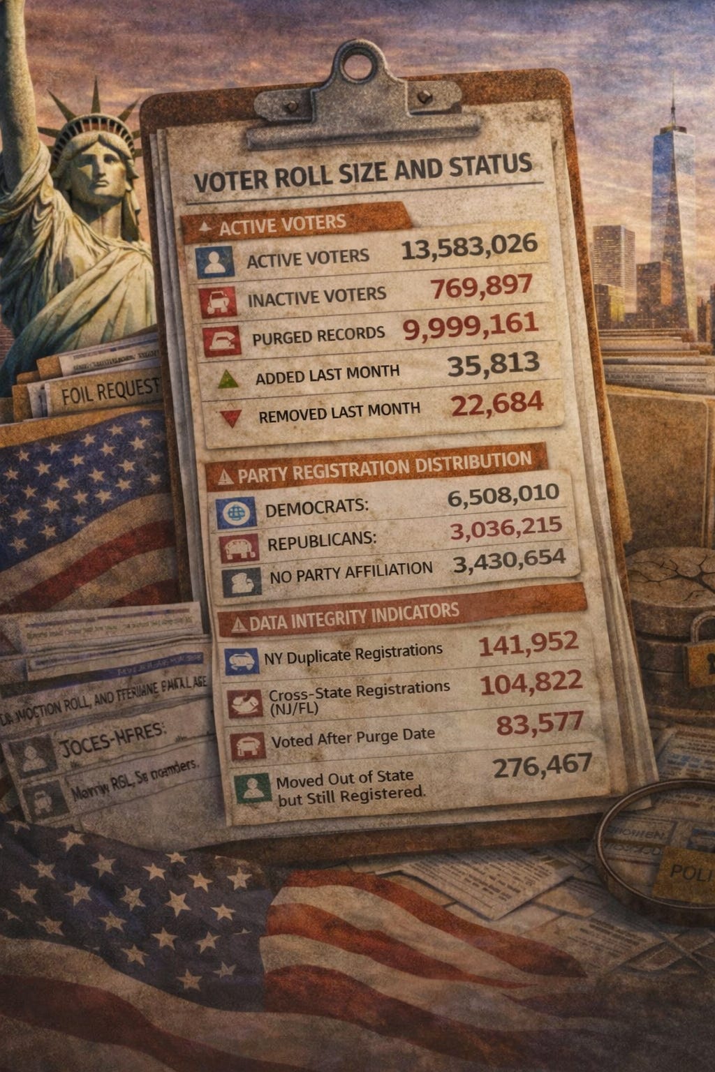 New York’s voter registration system contains millions of records accumulated over decades, reflecting moves, name changes, duplicate entries, and the administrative processes required to maintain them.