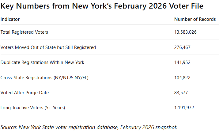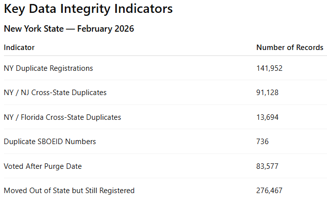 The February 10, 2026 voter file also identifies 141,952 duplicate registrations within New York’s own database.