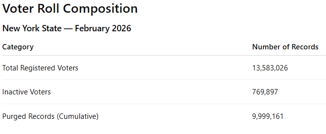 The most significant data point in the February 10th snapshot involves 276,467 voters who appear to have moved out of New York but remain registered in the state.