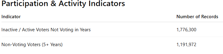 The February 10, 2026 dataset also indicates that 1,191,972 registered voters have not voted in at least five years. And 1,776,300 registrated voters who HAVE NEVER VOTED since registration.