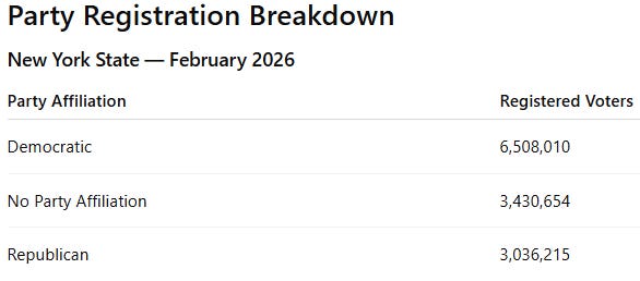 Party registration in New York continues to show a clear Democratic plurality, with 6,508,010 registered Democrats compared to 3,036,215 Republicans and 3,430,654 voters with no party affiliation. Notably, unaffiliated voters now represent a substantial share of the electorate, exceeding the number of Republican registrants and reflecting the growing role of independent voters in the state’s political landscape.